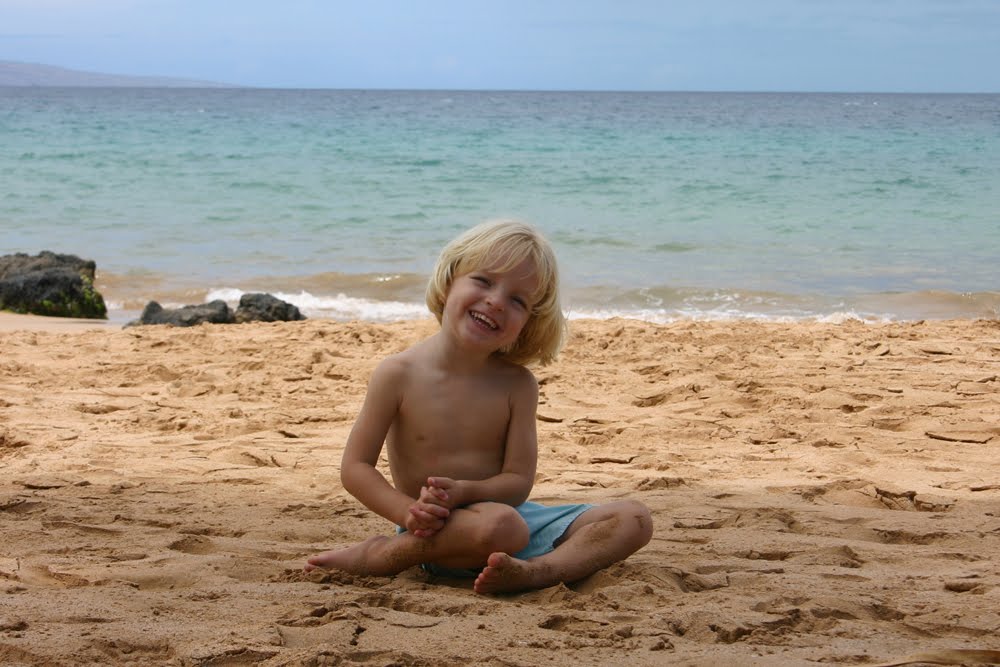We spent Sunday morning, May 16, enjoying the sun and surf at our favorite beach, Keawakapu, in Kihei. We got there bright and early and stayed for a few hours. The weather was beautiful despite the fact that it was a little hazy with our recent Kona winds. Dean had a blast as usual playing in the sand and insisted that Joel dig a giant hole for him to hide in and jump in and out of. Joel made the mistake of taking Dean with him on a long walk down the beach to Zach's to get some coffee - Dean always wants to play in the tidepools when you take him down to that end of the beach and then it's like pulling teeth to get him to walk back. My Mom, who takes him to this beach almost every Tuesday and Thursday, has figured out that if she draws arrows in the sand and tells Dean he has to follow the arrows back to their stuff, this usually works pretty well to get him moving. Joel didn't know that trick and they were gone FOREVER!! When they got back, it was so funny because Joel said the reason it took so long is that for some reason Dean insisted on stopping every 25 feet to draw an arrow in the sand and told Joel he had to follow the arrows!! So cute! Anyway, here are some pictures from our day...